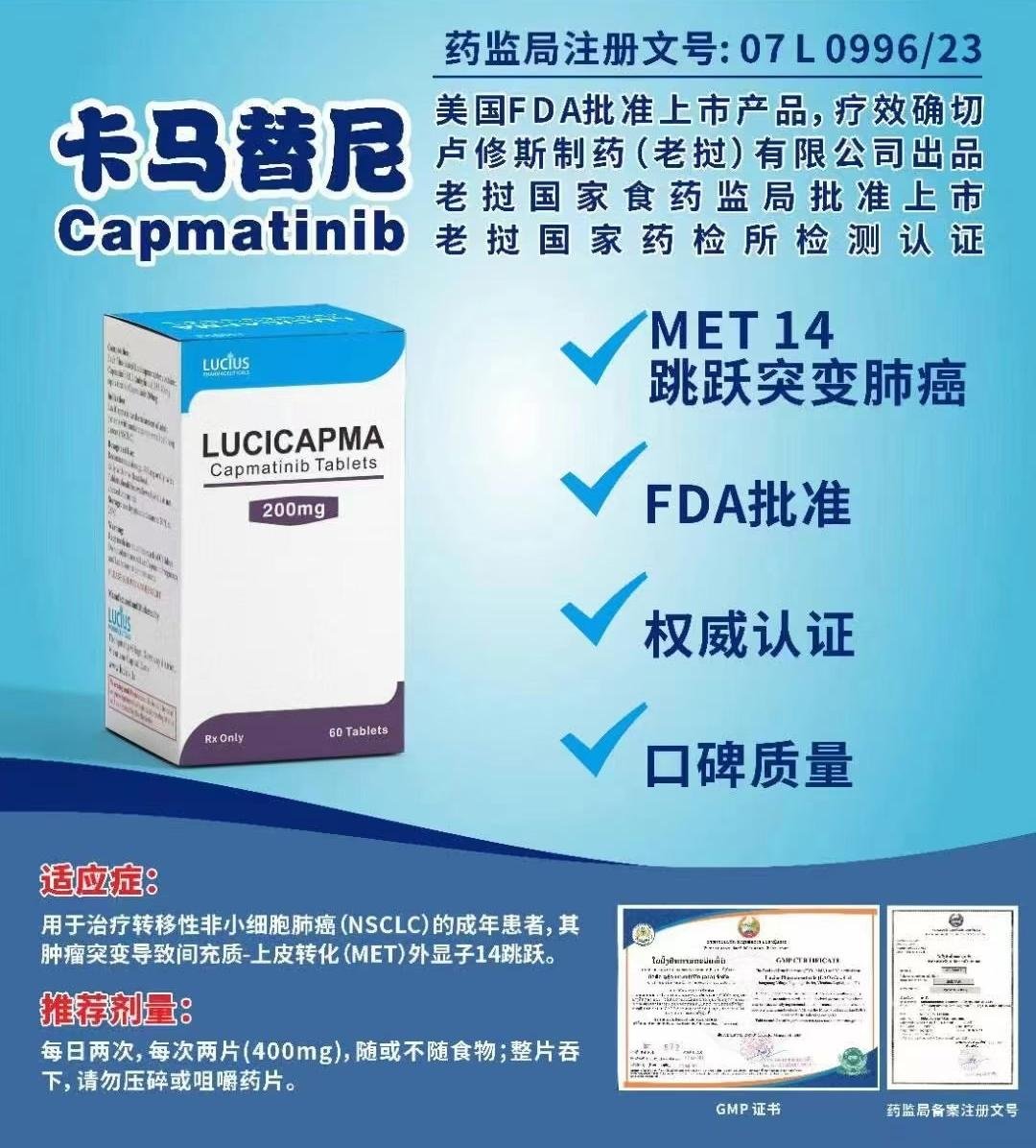 الدواعي: يُشار إليه للمرضى المصابين بسرطان الرئة غير صغير الخلايا المتقدم محليًا أو النقيلي والذين تم اختبارهم وتأكد وجود طفرات تخطي الإكسون 14 MET، عادةً كخيار علاجي من الخط الثاني أو الخط اللاحق.