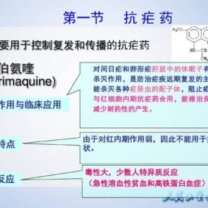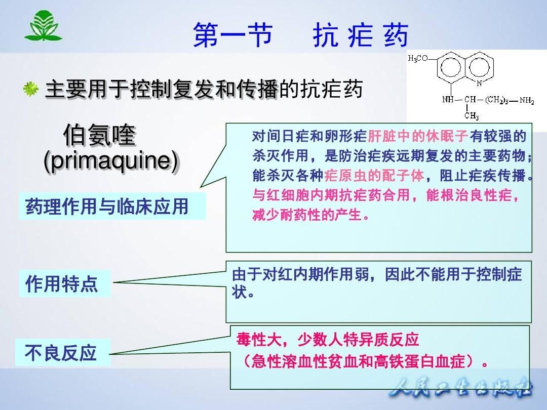 الوظيفة والدلالة: يستخدم بشكل رئيسي لعلاج الملاريا النشيطة والسيطرة على انتشار الملاريا. الاستخدام والجرعة: 1. الجرعة الشائعة للبالغين: تحسب حسب عقار البريماكين 3 أقراص يوميًا لمدة 7 أيام متتالية لعلاج الملاريا النشيطة لقتل الخلايا المشيمية للملاريا المنجلية، قرصين يوميًا لمدة 3 أيام متتالية 2. الجرعة الشائعة للأطفال: عن طريق الفم، محسوبة وفقًا للبريماكين، 0.39 ملغم / كغم يوميًا لمدة 14 يومًا متتالية لعلاج الملاريا النشيطة عند استخدامها لقتل الملاريا المنجلية التفاعلات الضارة: 1. التفاعلات الجانبية لهذا المنتج أعلى من تلك الخاصة بالأدوية المضادة للملاريا الأخرى عندما تتجاوز الجرعة اليومية 30 ملغ (مصفوفة)، التعب، الدوخة، الغثيان، القيء من المحتمل حدوث آلام في البطن وتفاعلات عكسية أخرى؛ قد يعاني عدد قليل من الأشخاص من حمى الدواء، ونقص المحببات، وما إلى ذلك، والتي يمكن استردادها بعد إيقاف الدواء. 2. قد يصاب الأشخاص الذين يعانون من نقص هيدروجيناز الجلوكوز 6 فوسفات بفقر الدم الانحلالي الحاد عند تناول هذا المنتج، يقتصر هذا التفاعل الانحلالي على خلايا الدم الحمراء القديمة ويمكن أن يتوقف عن التطور من تلقاء نفسه، وهو أمر غير خطير بشكل عام، وبمجرد حدوثه، يجب إيقاف الدواء وإعطاء علاج الأعراض المناسب عند تناول الجلوكوز-6 – نقص هيدروجيناز الفوسفات، سوف يسبب ميتهيموغلوبينية الدم، زرقة، ضيق الصدر وأعراض أخرى. يتم حقن أزرق الميثيلين 1-2 ملغم/كغم عن طريق الوريد لتحسين الأعراض بسرعة.
